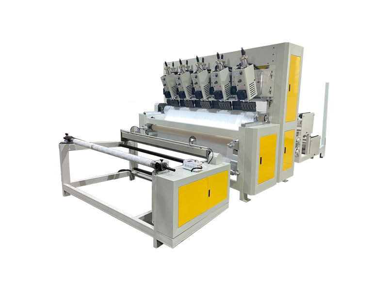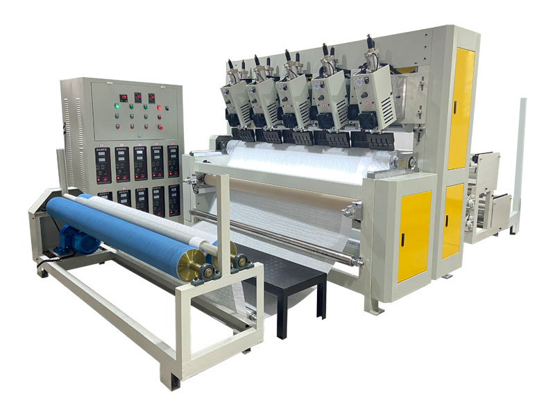 整機由壓花復合主機、超聲波控制柜、成品復卷機、存放織物支架組成。